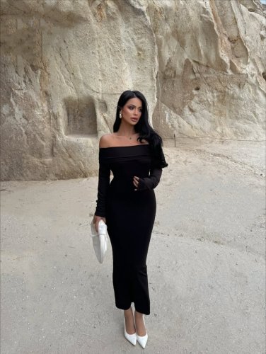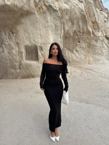 • Kadın uzun kollu Madonna yaka midi boy elbise