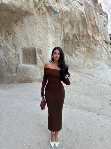 • Kadın uzun kollu Madonna yaka midi boy elbise