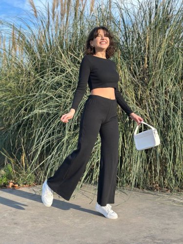 • Kadın uzun kollu kayık yaka kıza bluz ve bol paça pantolon ikili takım