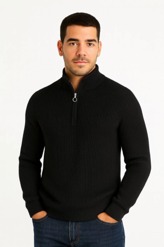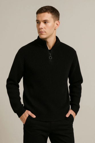 • Erkek Yarım Fermuarlı Triko Kazak Selanik Örgü Dik Yaka Pamuklu Dokuma Regular Fit Uzun Kollu Kışlık Model Siyah