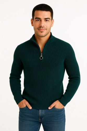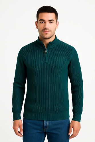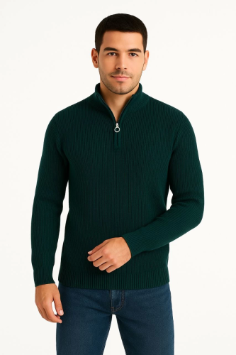 • Erkek Yarım Fermuarlı Triko Kazak Selanik Örgü Dik Yaka Pamuklu Dokuma Regular Fit Uzun Kollu Kışlık Model Haki